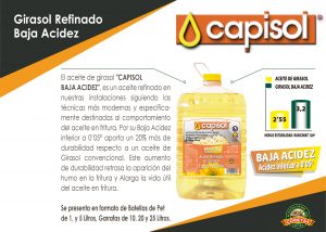 El aceite de girasol «CAPISOL BAJA ACIDEZ», es un aceite refinado a baja temperatura siguiendo las técnicas más modernas y específicamente destinadas al comportamiento del aceite en fritura.